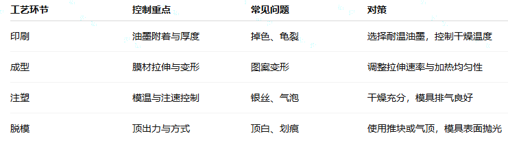 核心环节包括:印刷、成型、修边、模内注塑。其目的是在塑料件成型的同时完成表面装饰或功能集成。